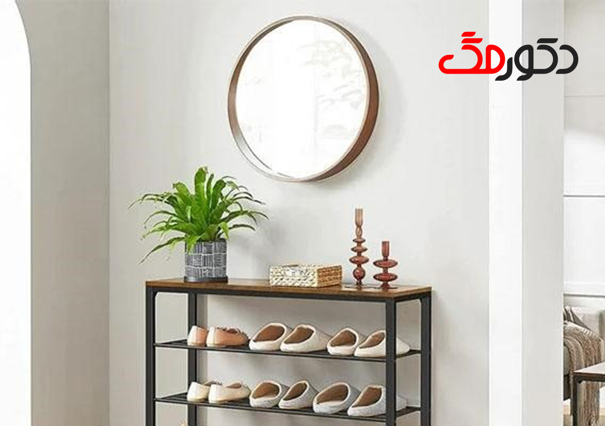 برای نتیجه بهتر، آینه را بالای جاکفشی نصب کنید و روی آن از مجسمههای سبک و کوچک استفاده کنید. جنس چوبی برای دکورهای گرم و مینیمال مناسبتر است و جنس فلزی با دکور کلاسیک هماهنگی بیشتری دارد.