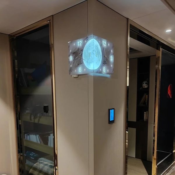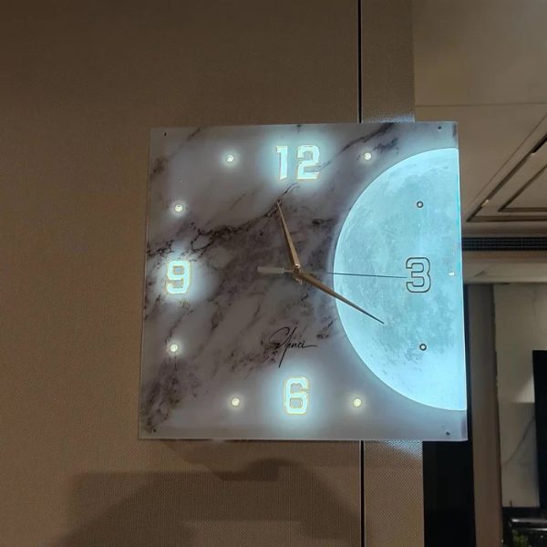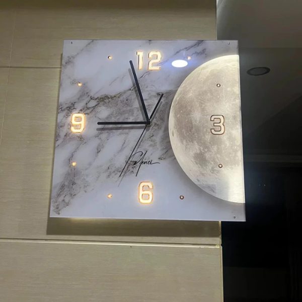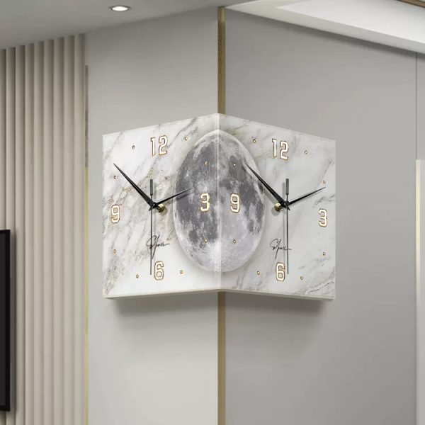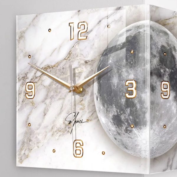 ساعت دیواری نبشی ماه مدل نوری ترکیب بینقصی از طراحی مدرن، هندسه فضا و ایجاد حس شاعرانه در خانه است که برای فضاهای اداری و خانههایی طراحی شده که دو زمان مختلف را قصد دارند مشاهده کنند. در طراحی ساعت دیواری نبشی ما ما از تلفیق زمان و ماه الهام گرفتیم تا به قول مجنون گذر زمان را از وجود ماه حس کنید. فرم زاویهدار ساعت، مرز میان دو دیوار را به فرصتی برای خلق هنر تبدیل میکند. در مرکز، تصویر ماه با نور ملایم خود، هم حس سکون و هم پویایی را القا میکند، گویی زمان در روشنای ماه متوقف شده است. در طراحی ساعت دیواری نبشی ماه نورانی ما دو صفحه ۹۰ درجه کنار هم قرار دادیم که هر یک با موتور مجزا کار کرده و شما میتوانید دو زمان مختلف را به صورت همزمان نشان دهید. در واقع این ترکیب زیبا بین طراحی و اجرا است که ساعت دیواری نبشی ماه نورانی را بیشتر از اینکه یک زمانسنج تبدیل کند به تابلوی دیواری زیبایی بدل کرده است.