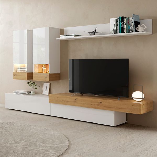 ست میز تلویزیونی آیسن بازتابی از آرامش و ظرافت است که ترکیب درخشندگی سفید براق با طراحی شاعرانه نماد صنعت دکوراسیون داخلی مدرن در داخل کشور است. این سبک که در آن استفاده از نور و تناسب نظمی حرف اول را میزند یکی از بهترین گزینهها برای کسانی است که همراه با سادگی قصد دارند لاکچری را نیز در خانه خود قرار دهند به همین دلیل به دنبال سبک مدرن و یا مینیمال در خانه خود هستند. در نگاه نخست، ترکیب باکسهای عمودی معلق و سطح افقی مینیمال، دیوار را به یک اثر هنری بدل میکند که تلویزیون در آن تنها بخشی از روایت کلی فضاست. آیسن با خطوط تمیز، نورپردازی ظریف و ترکیب متریالهای اصیل، روح سکون و تعادل را به دکوراسیون خانه میبخشد.