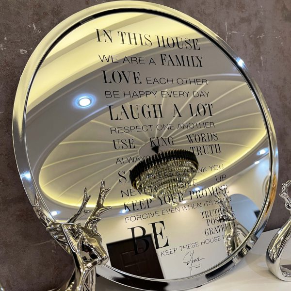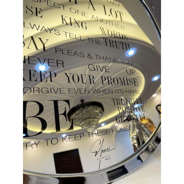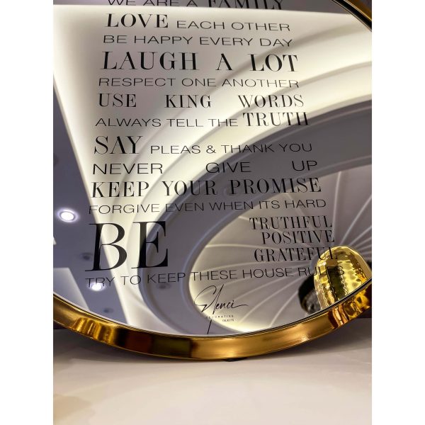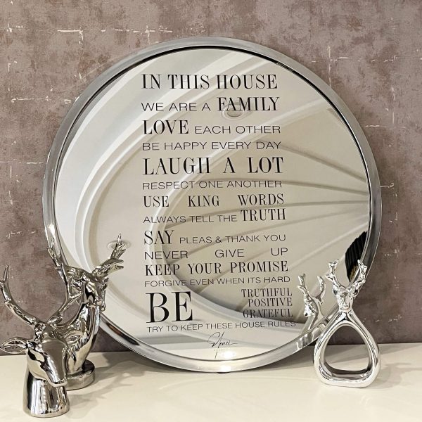 خرید قاب آینه آینه کنسول مدرن را باید یکی از اصول اولیه طراحی دکوراسیون داخلی در نظر داشته باشیم که از نظر معماری داخلی و فنگشویی حس و حال خانه را به کلی تغییر می دهد. قاب آینه فلزی قوانین خانه یک قاب پر مفهوم و فوق العاده است تا روزانه به شما یادآور خواهد شد که چه چیزهایی در زندگی از مهم ترین ها هستند. قاب آینه قوانین خانه از یک آینه ی دایره ای شکل به قطر 60 سانتی متر تشکیل شده که در دل خود جمله های با ارزشی را به زبان انگلیسی حک کرده است.