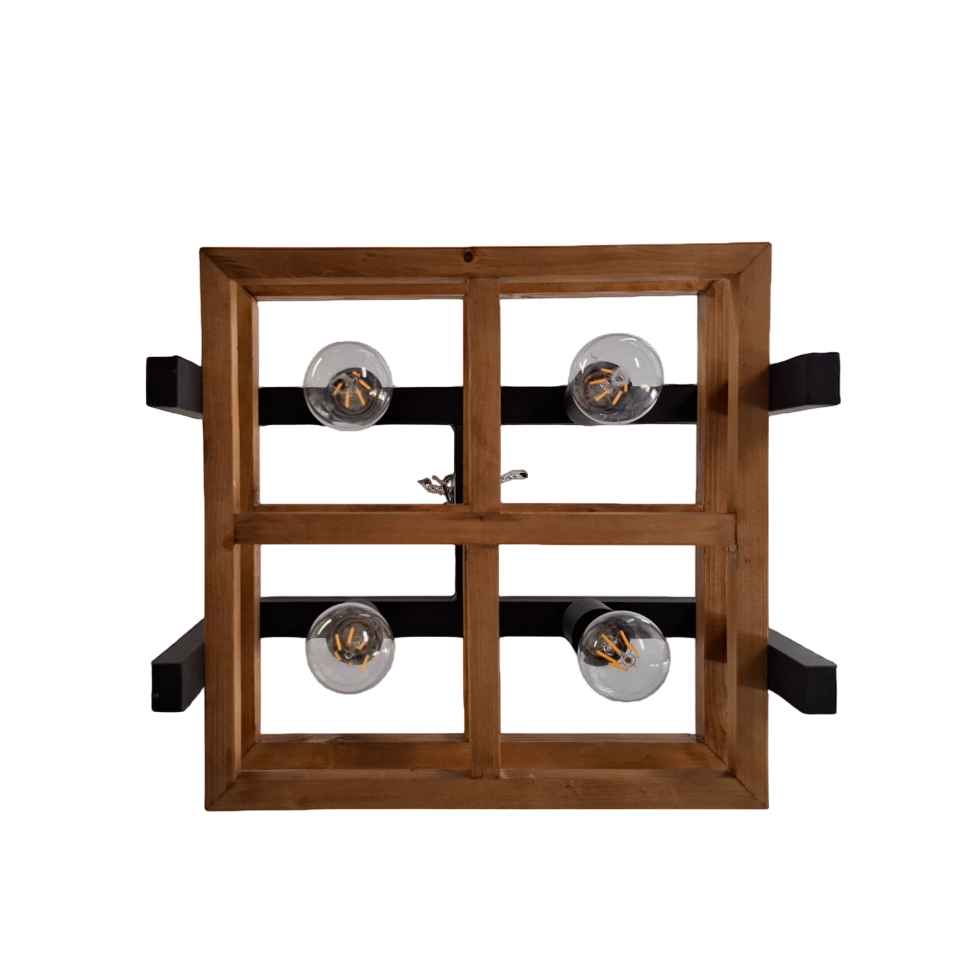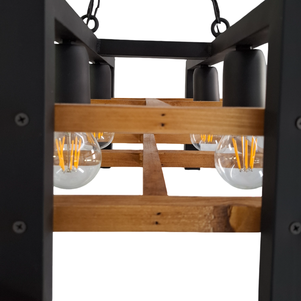 این لوستر روستیک، تجسمی از توازن میان خطوط دوار فلزی و زوایای مقتدرانه چوب است که گویی تکهای از طبیعت بکر را به کالبد خانهای مدرن تزریق میکند. حلقههای مشکی فلزی با ظرافتی خاص به دور قابهای چوبی با بافت زنده و اصیل تنیده شدهاند تا تضادی خیرهکننده میان سردی آهن و گرمای چوب ایجاد کنند. با روشن شدن چهار شعلهی این لوستر، نوری متمرکز و صمیمی از قلب این ساختار هندسی میتراود که با ایجاد سایهروشنهای جذاب بر روی سقف و دیوارها، اتمسفر فضا را به محیطی دنج، هنری و سرشار از اصالت تبدیل میکند.